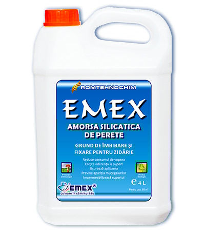 Amorsa Silicatica de Pereti “Emex” este un compus hidrosolubil pentru impregnarea gleturilor si zidariilor, cu continut de silicat de potasiu in dispersie apoasa, aditivi si adjuvanti, folosit pentru pregatirea suprafetelor si fixarea substratului in zugraveli profesionale de interior sau exterior, pe suprafete noi sau perfect curatate. Este un produs profesional, care se diferentiaza de celelalte amorse prin faptul ca penetreaza si consolideaza suprafata, realizand o rezistenta “in bloc” a acesteia. Compatibilitatea acestei amorse este foarte limitata, iar conditiile de aplicare sunt cu totul speciale, adresandu-se doar segmentului strict profesional.