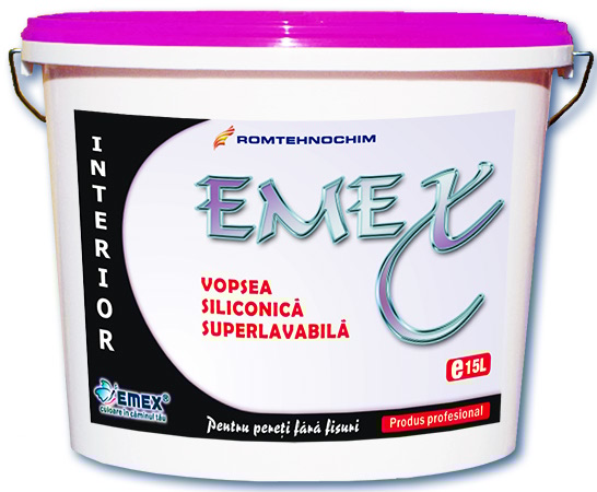 Vopseaua Emulsionata Lavabila Siliconica de Interior “Emex” este o vopsea profesionala, hidrosolubila, formulata pe baza de rasini sintetice in disperise apoasa, siliconi, pigmenti, fileri, extenderi si aditivi specifici, folosita la protectia si decorarea suprafetelor interioare. Caracteristicile superioare ale acestei vopsele, o recomanda pentru acele acoperiri care necesita un grad foarte mare de alb, o aderenta buna si un aspect neted opac. Pelicula rezultata nu permite aderarea murdariei, si se poate curata cu buretele, prin spalari repetate. Este disponibila in orice culoare conform paletarelor standard, sau la solicitarea clientului.