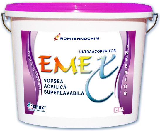 Vopseaua Emulsionata Superlavabila de Interior “Emex” este un produs superior, formulat pe baza de rasini acrilice, pigmenti, fileri si aditivi, cu aplicare atat la interior, avand caracteristici net superioare (acopera foarte bine, adera foarte bine la suporturi absorbante si neabsorbante, avand deasemeni o pelicula mata, neteda). In cazul unei aplicari corespunzatoare lavabilitatea ei este una foarte buna, permitand spalarea repetata a suprafetei vopsite fara modificarea caracteristicilor peliculei. Contine biocizi ecologici, care dau vopselei un comportament excelent la actiunea microorganismelor. Poate fi colorata in diferite nuate, la cererea beneficiarului.