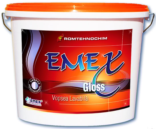 Vopseaua Emulsionata Lavabila Lucioasa “Emex Gloss” este un produs hidrosolubil, profesional, pe baza de rasini acrilice pure, pigmenti, materiale de umplutura si aditivi specifici, cu aplicare atat la interior cat si la exterior. Are o acoperire excelenta (un singur strat in conditiile unei pregatiri a suprafetelelor conform recomandarii producatorului), cu aspect lucios si aderenta superioara. Pelicula de vopsea nu permite aderenta murdariei cu usurinta, ea putand fi deasemeni curatata prin spalare repetata utilizand un burete umed. Se pot fabrica nuante in concordanta cu paletarul de culori, sau la solicitarea beneficiarului.