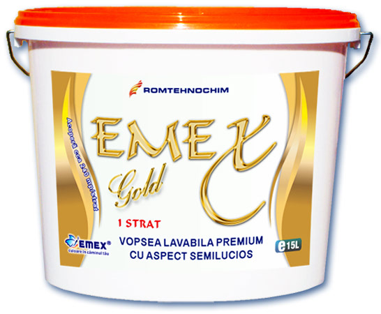 Vopseaua Emulsionata Lavabila Premium “Emex Gold” este o vopsea hidrosolubila profesionala, formulata pe baza de rasini acrilice, pigmenti, materiale de umplutura si aditivi speciali, cu aplicare atat la interior cat si la exterior, avand o acoperire foarte buna (un strat daca suprafetele sunt pregatite conform recomandarii producatorului), cu o pelicula semiluciosa si o aderenta excelenta. Pelicula de vopsea nu permite aderarea murdariei cu usurinta, si permite curatarea prin spalare, utilizand un burete umed. Este disponibila in orice nuanta atat in concordanta cu paletarele standard, cat si la solicitarea clientului.